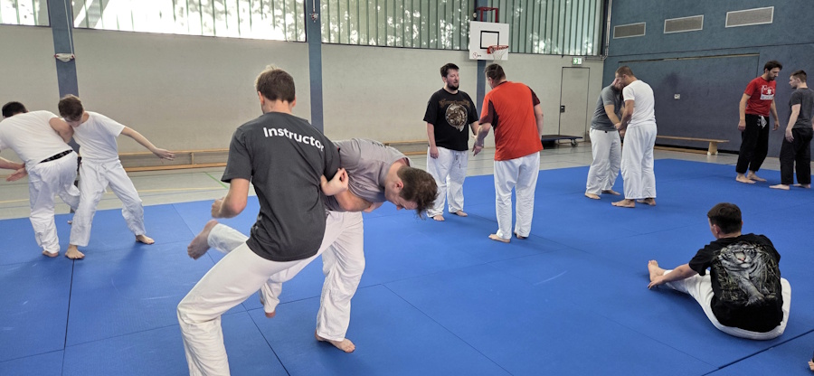 Das Thema des Lehrgangs waren Würfe mit und ohne Gi – also Techniken, die sowohl in der klassischen Uniform, in der traditionellerweise Jiu Jitsu trainiert wird, als auch im Kampf ohne sie angewendet werden können. Mit viel Engagement erklärten und demonstrierten David und Marijo die verschiedenen Wurfprinzipien, gingen auf technische Feinheiten ein und sorgten dafür, dass alle Teilnehmenden auf ihrem jeweiligen Niveau gefordert und gefördert wurden.
